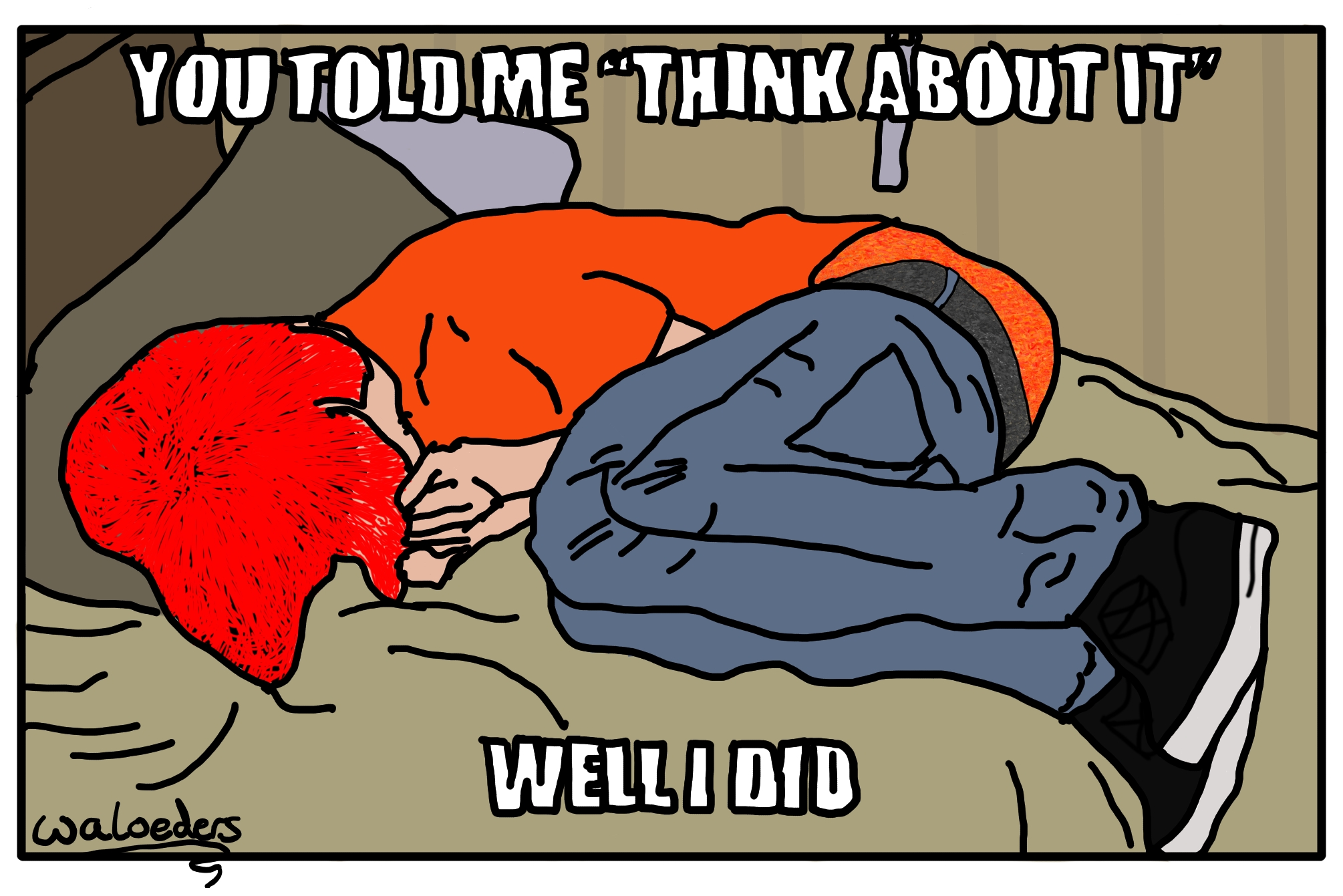Zawa covered in lipstick kiss marks and looking confused, saying "...what?"