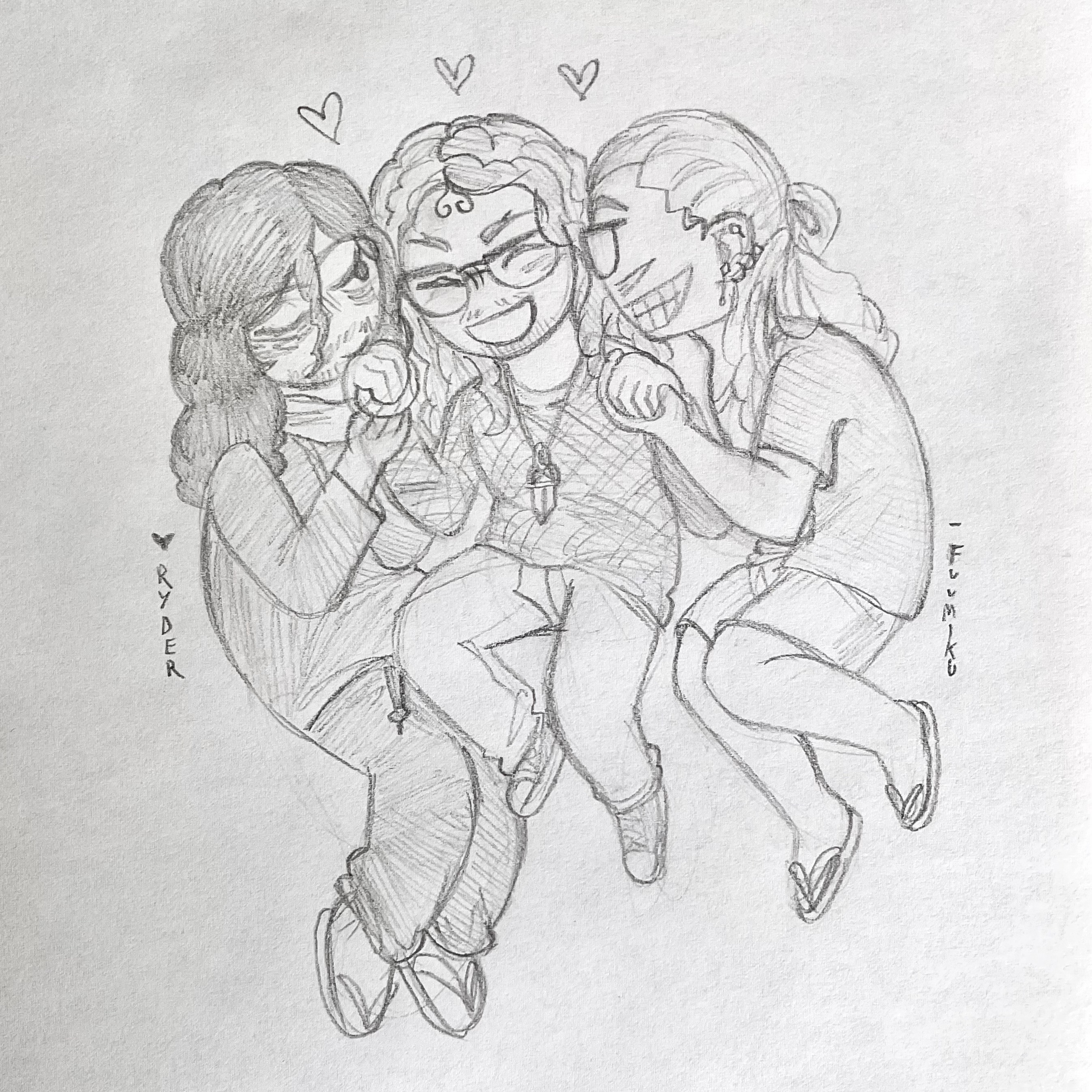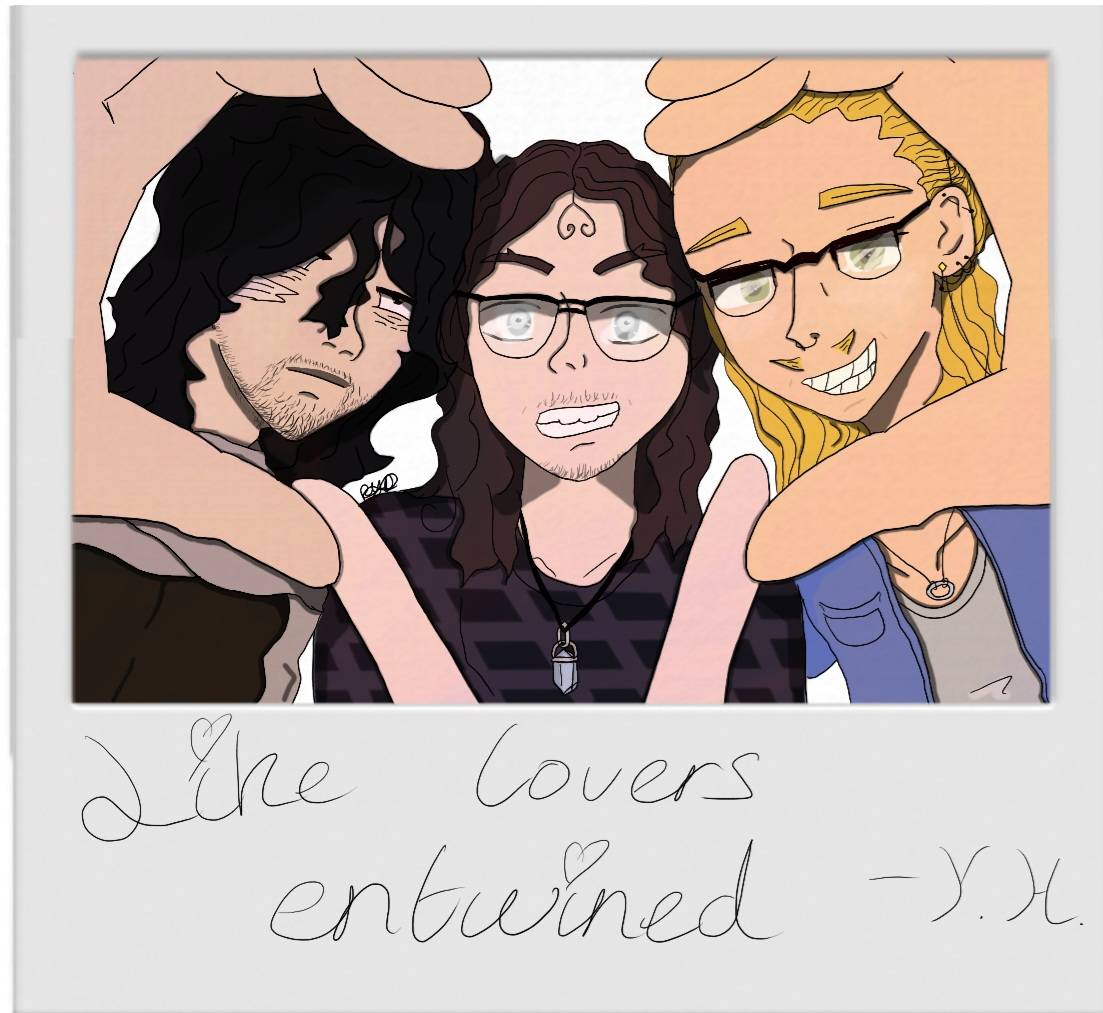 Zawa, Ry and Zashi making heart hands in a polaroid frame with the words "Like lovers entwined - Y.H." written below.