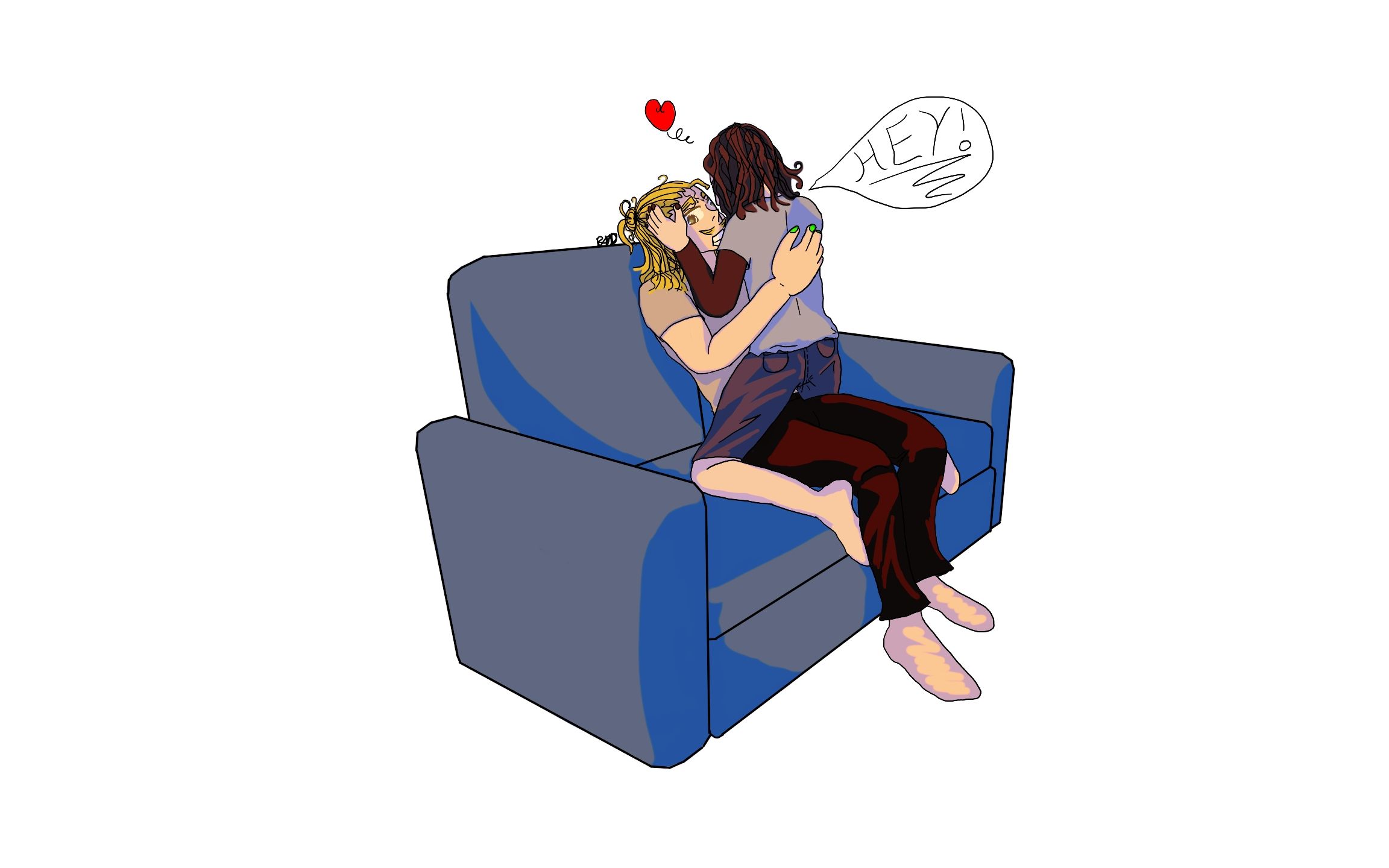 Ry sittin on Zashi on a sofa, with Zashi shouting "Hey!" at being interrupted.